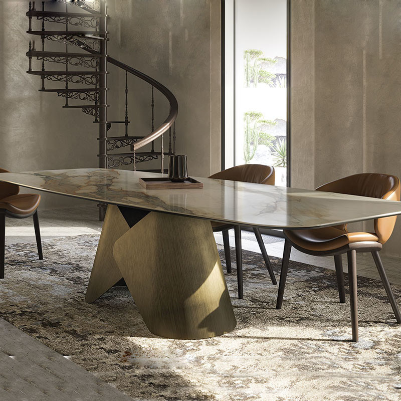 Se introduce un acabado exclusivo para la base de esta moderna mesa de comedor, especialmente diseñada para realzar el modelo.El acabado de latón oxidado está completamente cepillado a mano y tiene un tinte oxidante que se oscurece hacia el suelo.